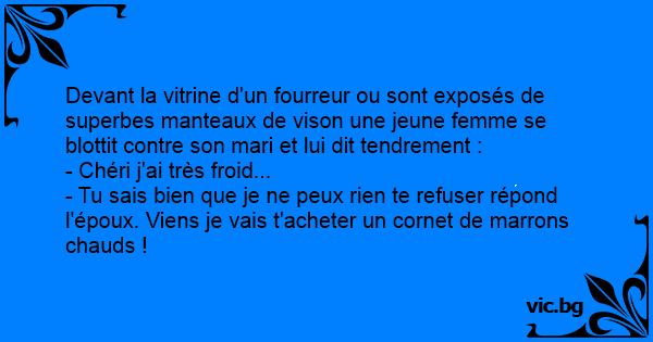 - Tu sais bien que je ne peux rien te refuser répond l'époux. Viens je vais t'acheter un cornet de marrons chauds !