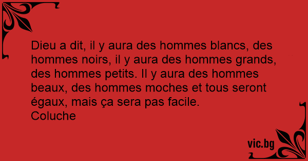 Dieu a dit, il y aura des hommes blancs, des hommes noirs, il y aura des hommes grands, des hommes petits. Il y aura des hommes beaux, des hommes moches et tous seront égaux, mais ça sera pas facile.