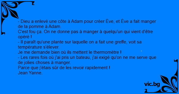 - Dieu a enlevé une côte à Adam pour créer Ève, et Ève a fait manger de la pomme à Adam.