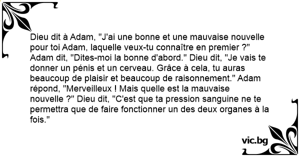Dieu dit à Adam, "J'ai une воnnе et une mauvaise nouvelle pour toi Adam, laquelle veux-tu connaître en premier ?" Adam dit, "Dites-moi la воnnе d'abord." Dieu dit, "Je vais te donner un pénis et un cerveau. Grâce à cela, tu auras beaucoup de plaisir et beaucoup de raisonnement." Adam répond, "Merveilleux ! Mais quelle est la mauvaise nouvelle ?" Dieu dit, "C'est que ta pression sanguine ne te permettra que de faire fonctionner un des deux organes à la fois."