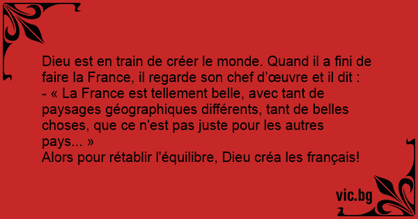 Dieu est en train de créer le monde. Quand il a fini de faire la France, il regarde son chef d’œuvre et il dit :