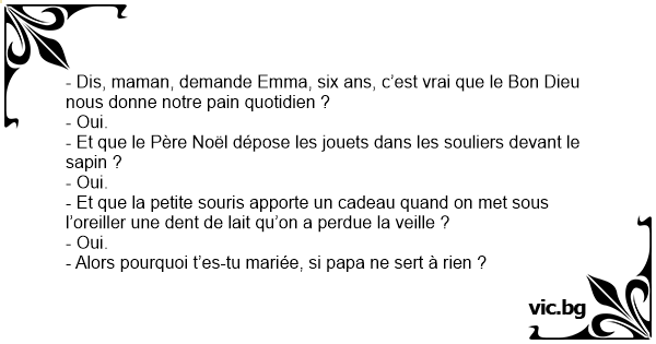 - Dis, maman, demande Emma, six ans, c’est vrai que le Bon Dieu nous donne notre pain quotidien ?