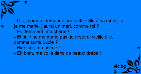 - Dis, maman, demande une petite fille à sa mère, si je me marie, j’aurai un mari, comme toi ? - Evidemment, ma chérie ! - Et si je ne me marie pas, je resterai vieille fille, comme tante Lucie ? - Bien sûr, ma chérie ! - Eh bien, me voilà dans de beaux draps !