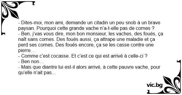 - Dites-moi, mon ami, demande un citadin un peu snob à un brave paysan. Pourquoi cette grande vache n’a-t-elle pas de cornes ?