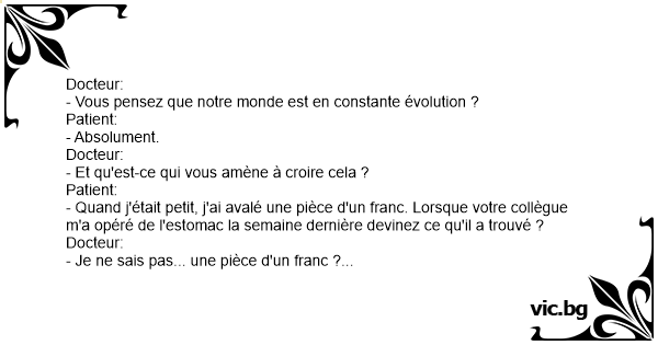 - Quand j'était petit, j'ai avalé une pièce d'un franc. Lorsque votre collègue m'a opéré de l'estomac la semaine dernière devinez ce qu'il a trouvé ?