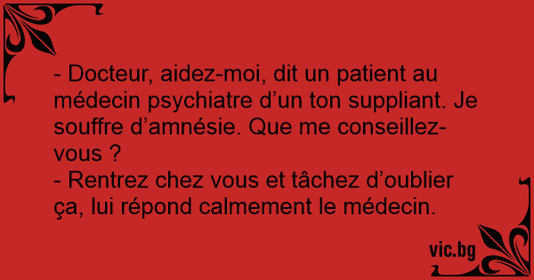 - Docteur, aidez-moi, dit un patient au médecin psychiatre d’un ton suppliant. Je souffre d’amnésie. Que me conseillez- vous ?