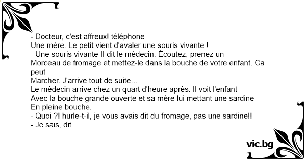 - Une souris vivante !! dit le médecin. Écoutez, prenez un