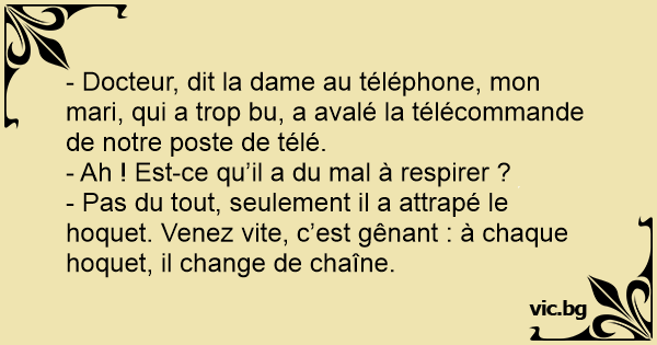 - Docteur, dit la dame au téléphone, mon mari, qui a trop bu, a avalé la télécommande de notre poste de télé.