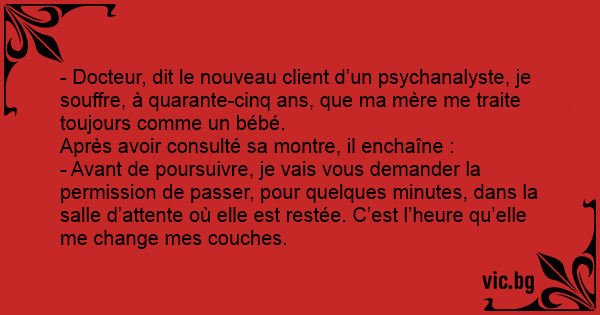 - Docteur, dit le nouveau client d’un psychanalyste, je souffre, à quarante-cinq ans, que ma mère me traite toujours comme un bébé.