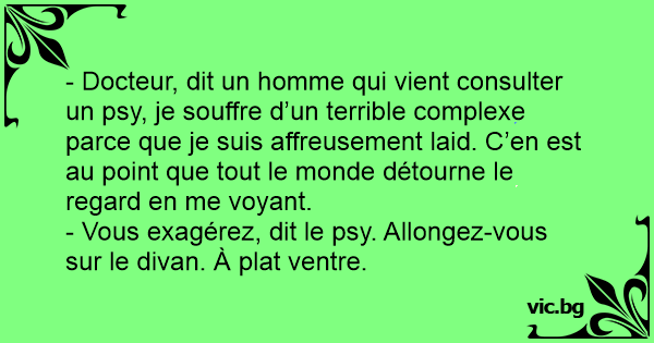 - Docteur, dit un homme qui vient consulter un psy, je souffre d’un terrible complexe parce que je suis affreusement laid. C’en est au point que tout le monde détourne le regard en me voyant.