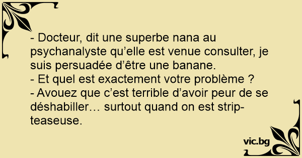 - Docteur, dit une superbe nana au psychanalyste qu’elle est venue consulter, je suis persuadée d’être une banane.