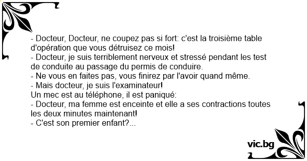 - Docteur, ma femme est enceinte et elle a ses contractions toutes les deux minutes maintenant!