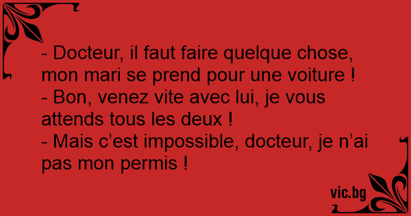 - Docteur, il faut faire quelque chose, mon mari se prend pour une voiture !
