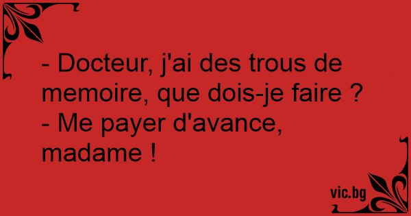 - Docteur, Docteur, j'ai des pertes de mémoire, que puis je faire ? Le docteur lui répond : - Et bien, payez moi d'avance !