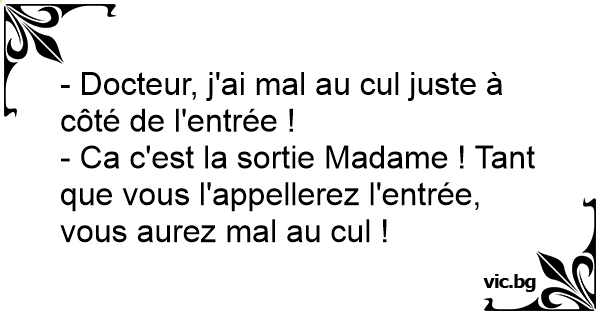 - Ca c'est la sortie Madame ! Tant que vous l'appellerez l'entrée, vous aurez mal au cul !