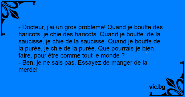 - Docteur, j'ai un gros problème! Quand je bouffe des haricots, je chie des haricots. Quand je bouffe de la saucisse, je chie de la saucisse. Quand je bouffe de la purée, je chie de la purée. Que pourrais-je bien faire, pour être comme tout le monde ?