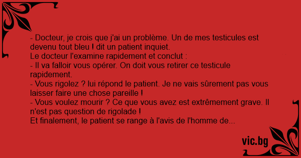 - Docteur, c'est pas de chance, mais je crois bien que le testicule qui me reste est en train de virer au bleu comme l'autre.