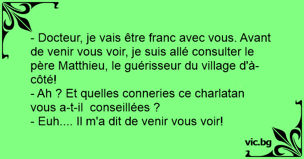 - Docteur, je vais être franc avec vous. Avant de venir vous voir, je suis allé consulter le père Matthieu, le guérisseur du village d'à-côté!