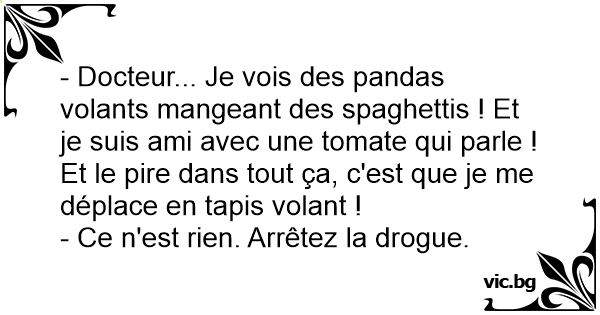 - Docteur... Je vois des pandas volants mangeant des spaghettis ! Et je suis ami avec une tomate qui parle ! Et le pire dans tout ça, c'est que je me déplace en tapis volant !