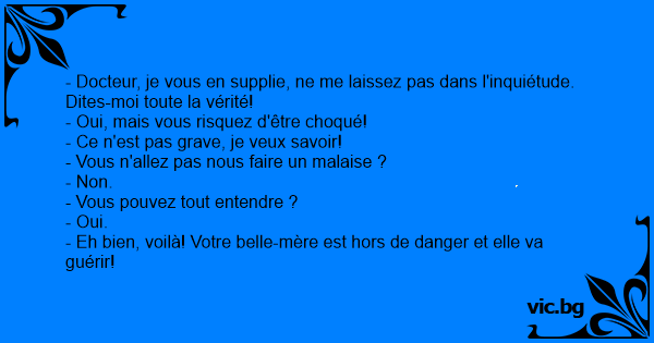 - Docteur, je vous en supplie, ne me laissez pas dans l'inquiétude. Dites-moi toute la vérité!