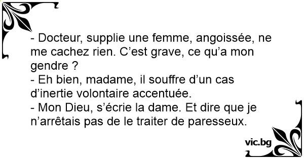 - Docteur, supplie une femme, angoissée, ne me cachez rien. C’est grave, ce qu’a mon gendre ?