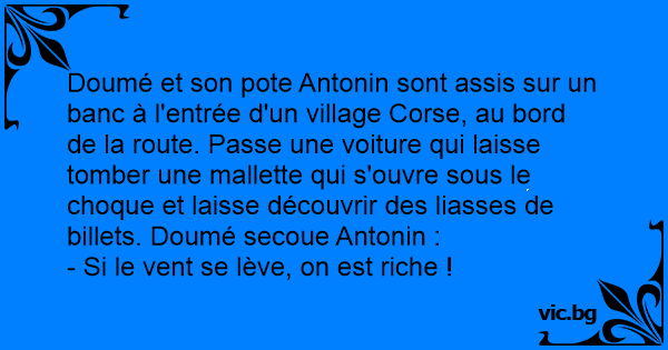 Doumé et son pote Antonin sont assis sur un banc à l'entrée d'un village Corse, au bord de la route. Passe une voiture qui laisse tomber une mallette qui s'ouvre sous le choque et laisse découvrir des liasses de billets. Doumé secoue Antonin :