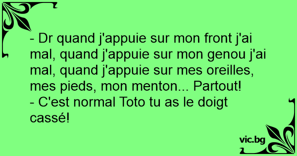 - Dr quand j'appuie sur mon front j'ai mal, quand j'appuie sur mon genou j'ai mal, quand j'appuie sur mes oreilles, mes pieds, mon menton... Partout!