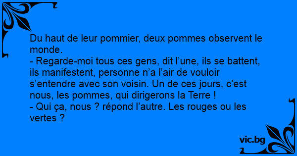 - Regarde-moi tous ces gens, dit l’une, ils se battent, ils manifestent, personne n’a l’air de vouloir s’entendre avec son voisin. Un de ces jours, c’est nous, les pommes, qui dirigerons la Terre !
