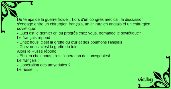 Du temps de la guerre froide... Lors d'un congrès médical, la discussion s'engage entre un chirurgien français, un chirurgien anglais et un chirurgien soviétique: