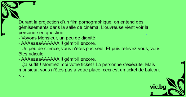 Durant la projection d’un film pornographique, on entend des gémissements dans la salle de cinéma. L’ouvreuse vient voir la personne en question :