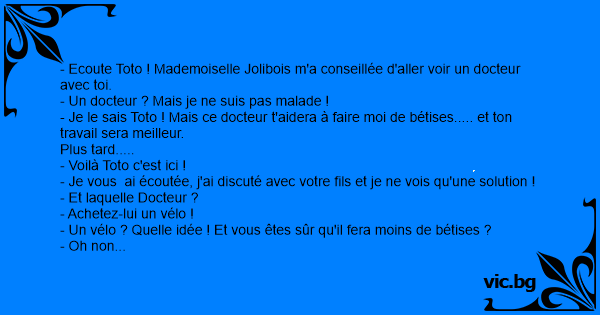- Ecoute Toto ! Mademoiselle Jolibois m'a conseillée d'aller voir un docteur avec toi.