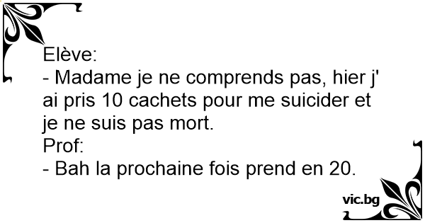 - Madame je ne comprends pas, hier j' ai pris 10 cachets pour me suicider et je ne suis pas mort.