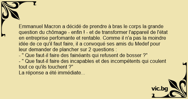 Emmanuel Macron a décidé de prendre à bras le corps la grande question du chômage - enfin ! - et de transformer l'appareil de l'état en entreprise perfomante et rentable. Comme il n'a pas la moindre idée de ce qu'il faut faire, il a convoqué ses amis du Medef pour leur demander de plancher sur 2 questions :