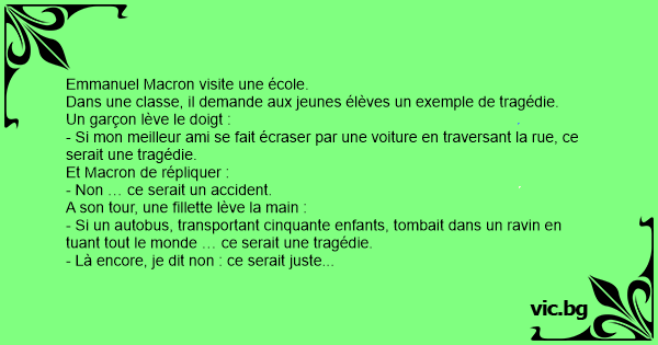 Dans une classe, il demande aux jeunes élèves un exemple de tragédie.