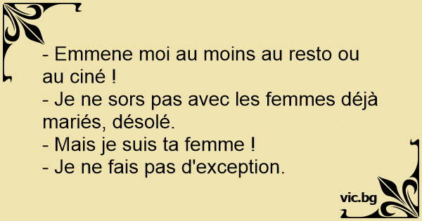 - Invita-ma si pe mine la un restaurant, un bar, ceva... - Nu ies cu femei casatorite! - Dar sunt nevasta ta!!! - Nu fac exceptii!