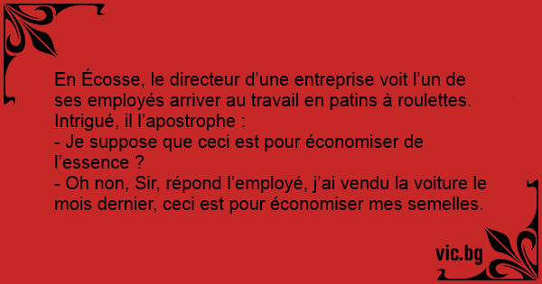 - Oh non, Sir, répond l’employé, j’ai vendu la voiture le mois dernier, ceci est pour économiser mes semelles.