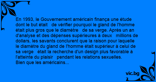 En 1993, le Gouvernement américain finança une étude dont le but était de vérifier pourquoi le gland de l'homme était plus gros que le diamètre de sa verge. Après un an d'analyse et des dépenses supérieures à deux millions de dollars, les savants conclurent que la raison pour laquelle le diamètre du gland de l'homme était supérieur à celui de sa verge était la recherche d'un design plus favorable à l'atteinte du plaisir pendant les relations sexuelles.