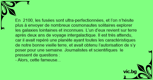 En 2100, les fusées sont ultra-perfectionnées, et l’on n’hésite plus à envoyer de nombreux cosmonautes solitaires explorer les galaxies lointaines et inconnues. L’un d’eux revient sur terre après deux ans de voyage intergalactique. Il est très attendu, car il avait repéré une planète ayant toutes les caractéristiques de notre воnnе vieille terre, et avait obtenu l’autorisation de s’y poser pour une semaine. Journalistes et scientifiques le pressent de questions :