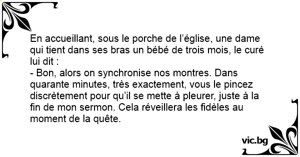 - Bon, alors on synchronise nos montres. Dans quarante minutes, très exactement, vous le pincez discrètement pour qu’il se mette à pleurer, juste à la fin de mon sermon. Cela réveillera les fidèles au moment de la quête.