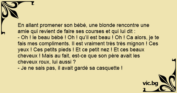 En allant promener son bébé, une blonde rencontre une amie qui revient de faire ses courses et qui lui dit :