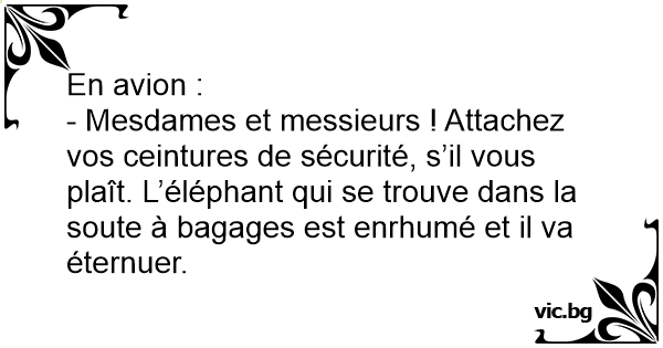 - Mesdames et messieurs ! Attachez vos ceintures de sécurité, s’il vous plaît. L’éléphant qui se trouve dans la soute à bagages est enrhumé et il va éternuer.