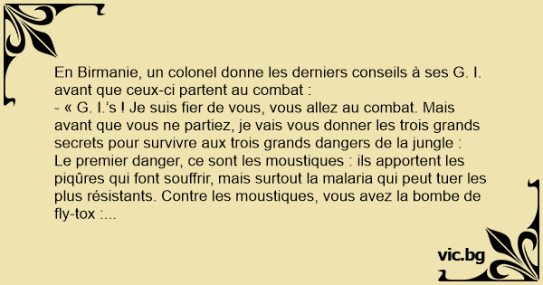 - « Ahh, colonel, c’était terrible… Les moustiques, des nuées de moustiques… Mais j’ai fait comme vous nous avez conseillé : j’ai pris le fly-tox, j’ai vaporisé, j’ai tué des milliers de moustiques. Ma bombe s’est vidée, j’ai pris la bombe de rechange dans la poche droite, et j’ai continué à vaporiser. La deuxième bombe s’est vidée, et il y avait encore des moustiques, alors j’ai pris la bombe sur le cadavre de mon copain qui était tombé à coté de moi, et j’ai continué à vaporiser… Au moment où la bombe finissait, j’ai tué le dernier moustique qui est tombé raide mort. J’étais sauvé. »