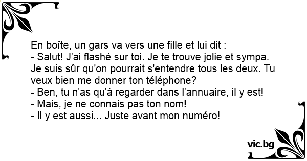 - Salut! J'ai flashé sur toi. Je te trouve jolie et sympa. Je suis sûr qu'on pourrait s'entendre tous les deux. Tu veux bien me donner ton téléphone?