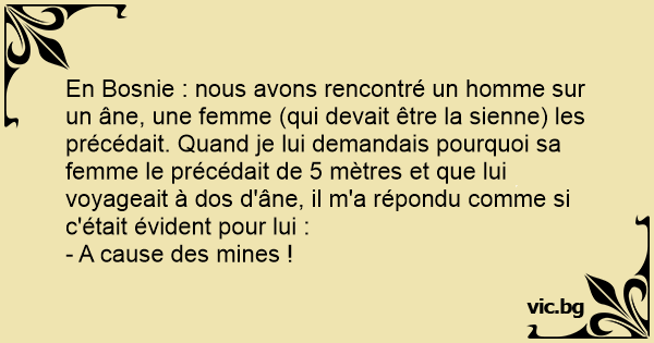 En Bosnie : nous avons rencontré un homme sur un âne, une femme (qui devait être la sienne) les précédait. Quand je lui demandais pourquoi sa femme le précédait de 5 mètres et que lui voyageait à dos d'âne, il m'a répondu comme si c'était évident pour lui :