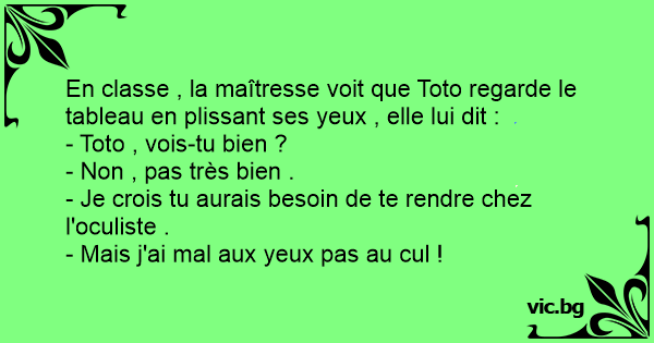 En classe , la maîtresse voit que Toto regarde le tableau en plissant ses yeux , elle lui dit :