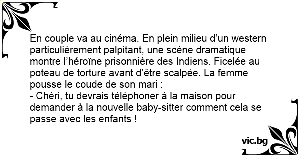 En couple va au cinéma. En plein milieu d’un western particulièrement palpitant, une scène dramatique montre l’héroïne prisonnière des Indiens. Ficelée au poteau de torture avant d’être scalpée. La femme pousse le coude de son mari :