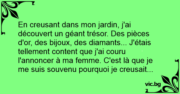 En creusant dans mon jardin, j'ai découvert un géant trésor. Des pièces d'or, des bijoux, des diamants... J'étais tellement content que j'ai couru l'annoncer à ma femme. C'est là que je me suis souvenu pourquoi je creusait...