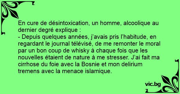 - Depuis quelques années, j’avais pris l’habitude, en regardant le journal télévisé, de me remonter le moral par un bon coup de whisky à chaque fois que les nouvelles étaient de nature à me stresser. J’ai fait ma cirrhose du foie avec la Bosnie et mon delirium tremens avec la menace islamique.