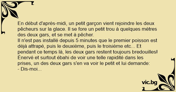 Énervé et surtout ébahi de voir une telle rapidité dans les prises, un des deux gars s'en va voir le petit et lui demande: