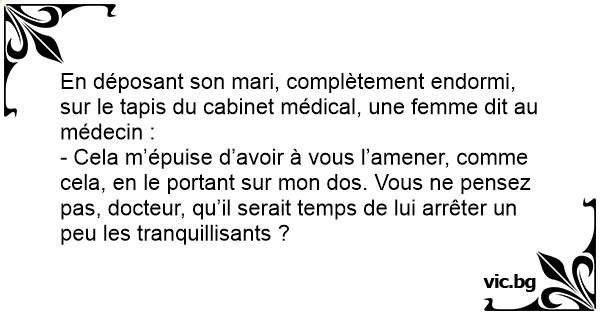 En déposant son mari, complètement endormi, sur le tapis du cabinet médical, une femme dit au médecin :